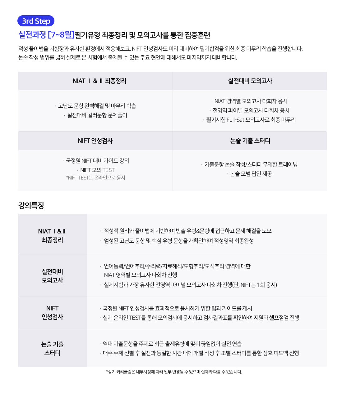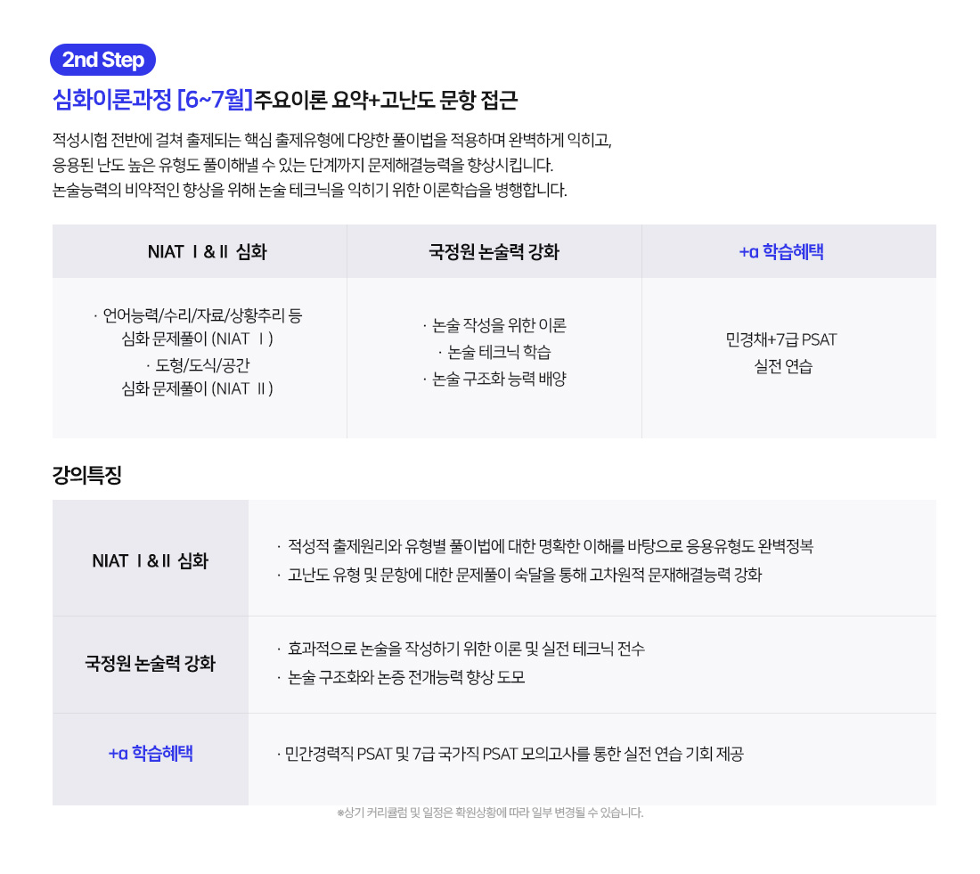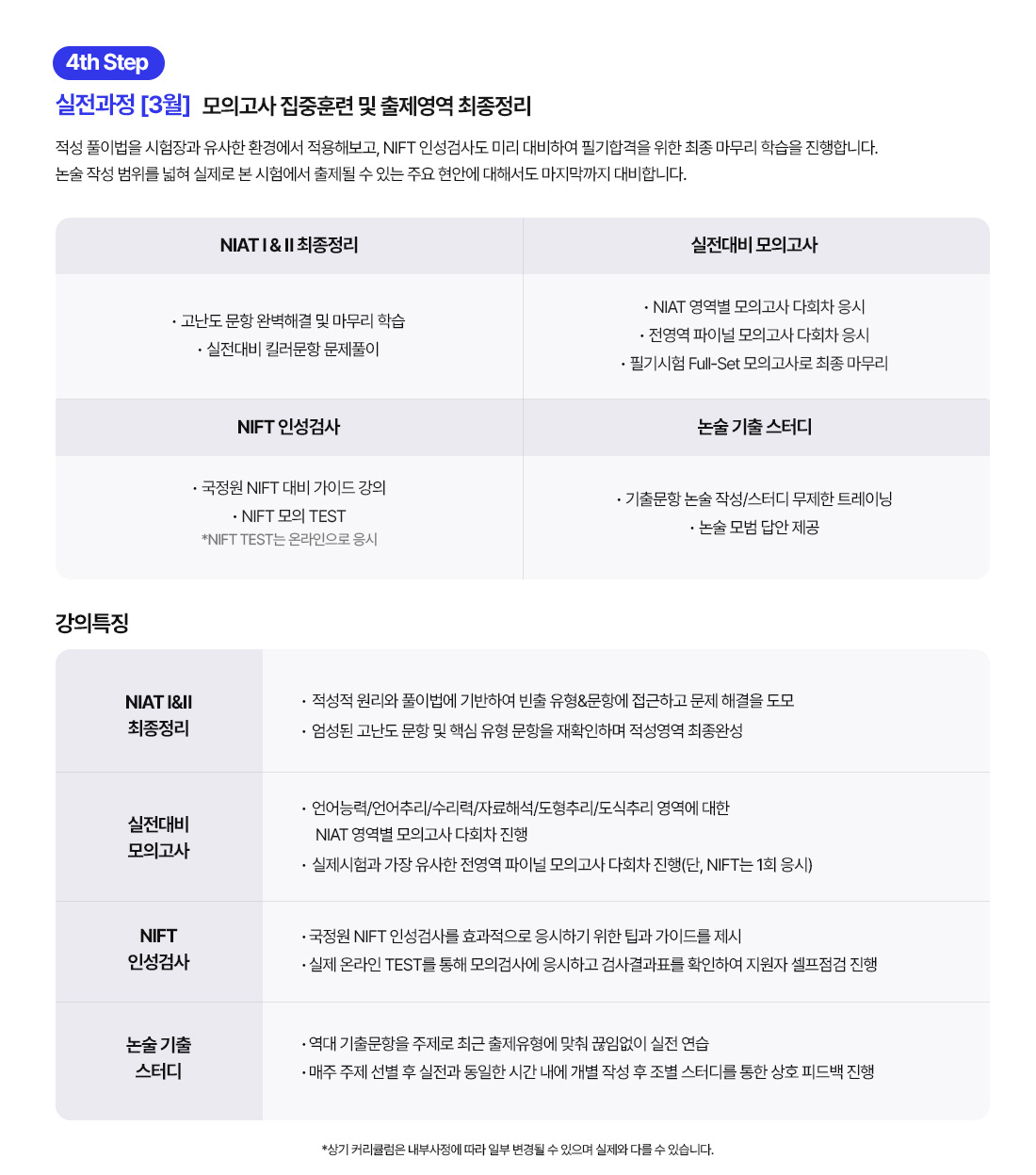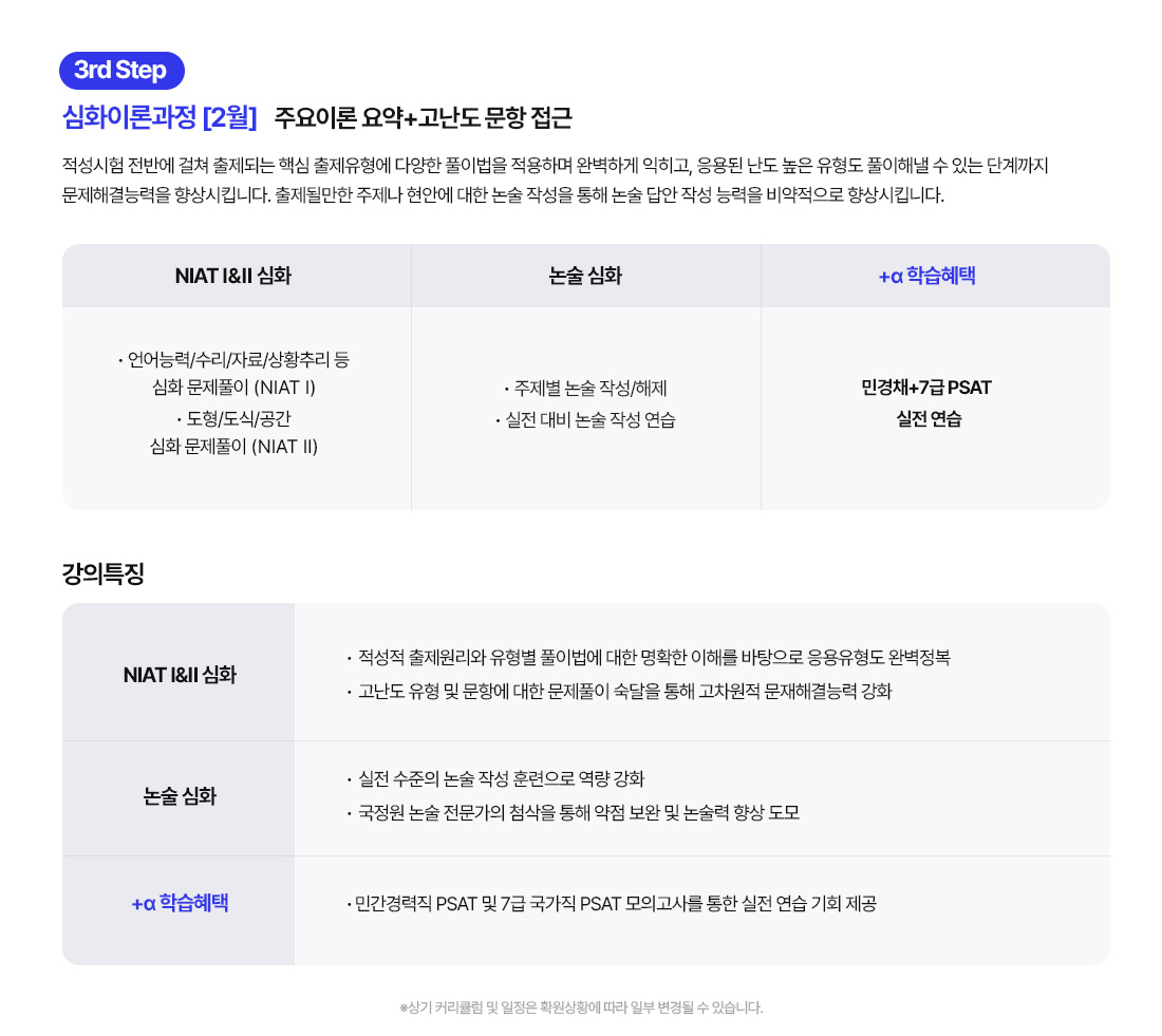 - 학원 상황에 따라 세부일정은 일부 변경될 수 있으며, 변경 시 수강 신청자에 한하여 별도로 안내드릴 예정입니다.