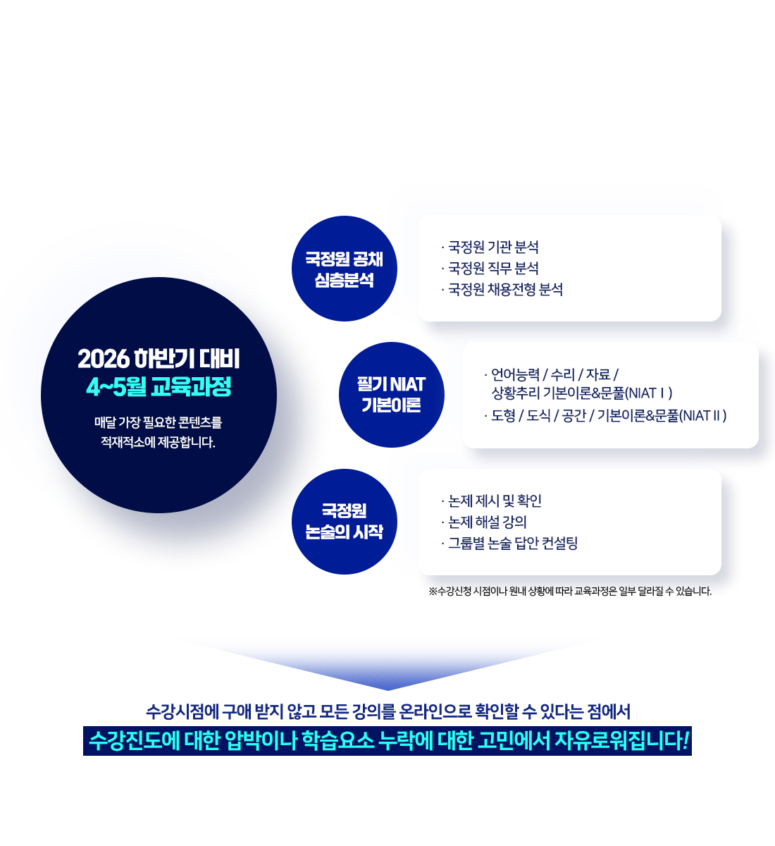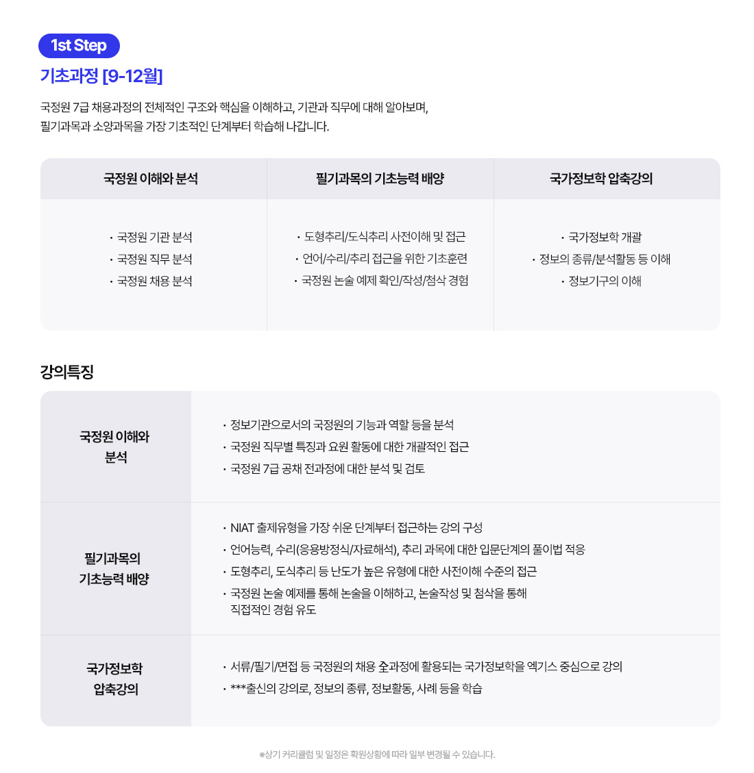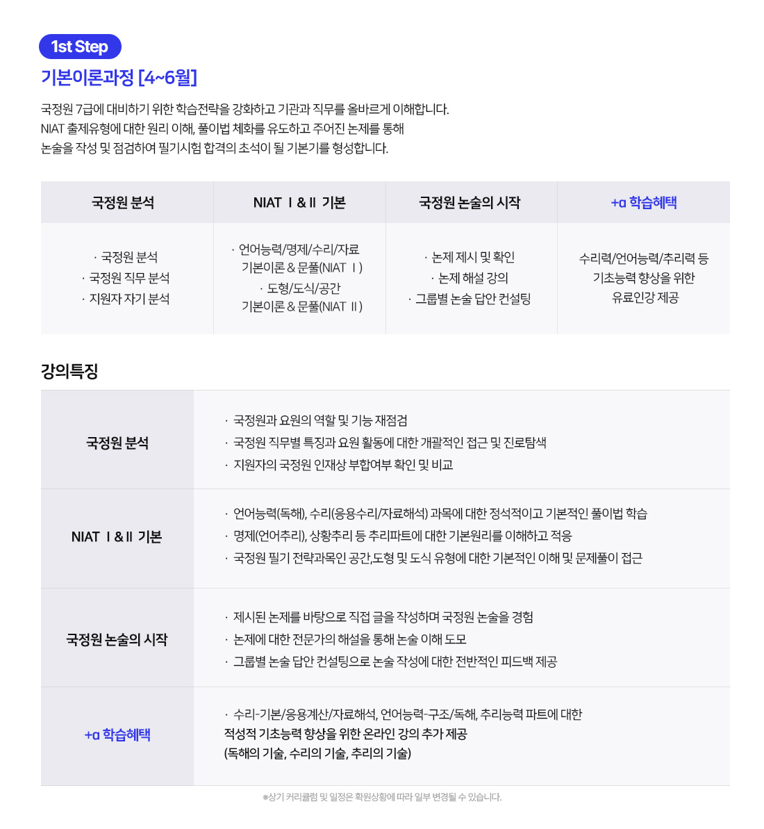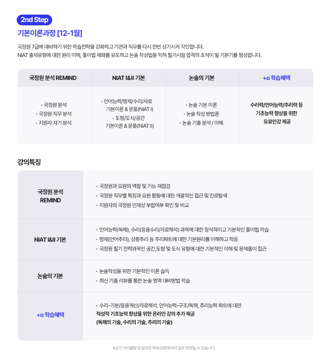 - 학원 상황에 따라 세부일정은 일부 변경될 수 있으며, 변경 시 수강 신청자에 한하여 별도로 안내드릴 예정입니다.