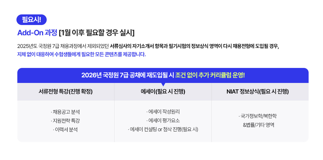 - 본 상품은 국정원 특정직 7급 공채를 대비하기 위한 콘텐츠로 구성되며 현장 수강 전용 상품입니다.